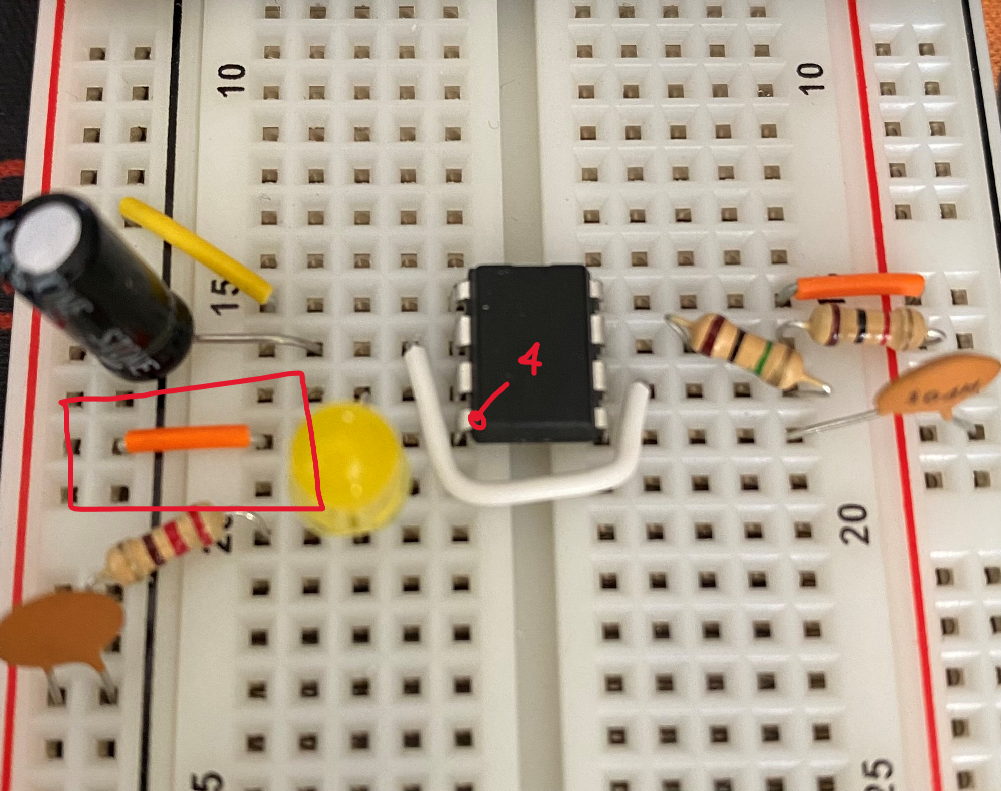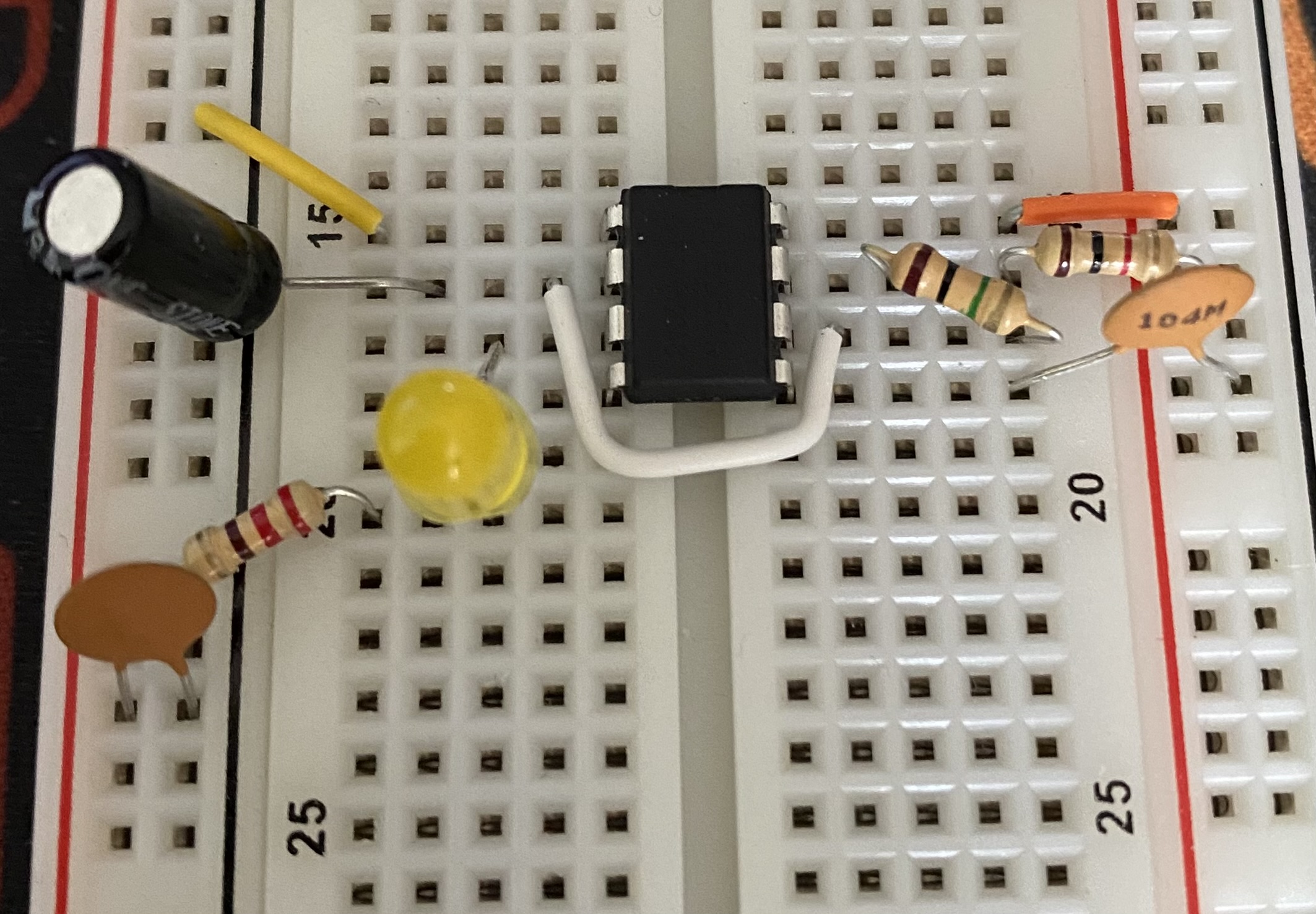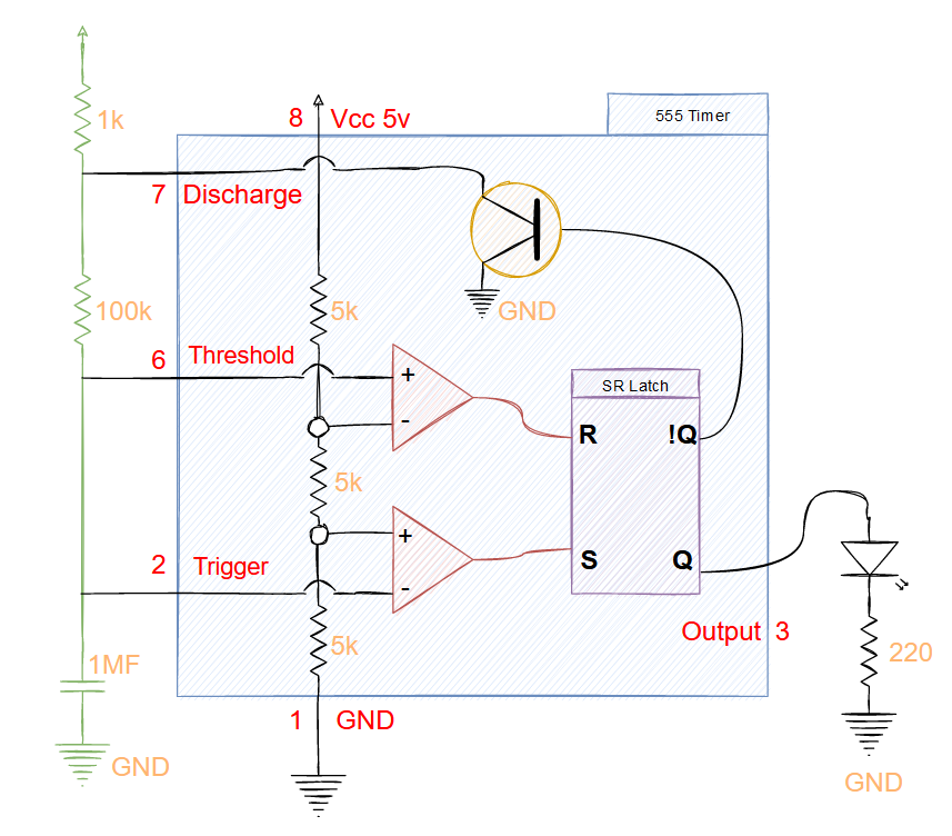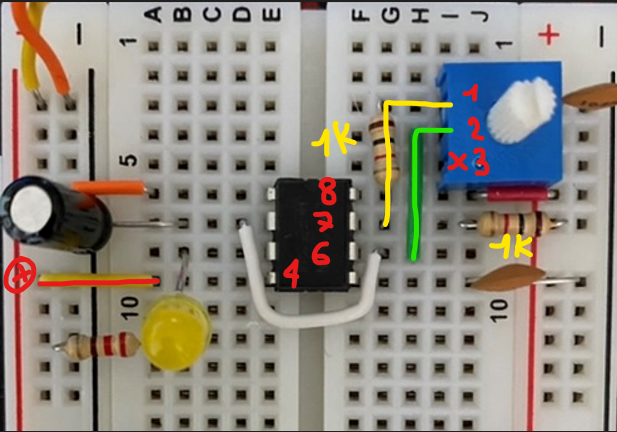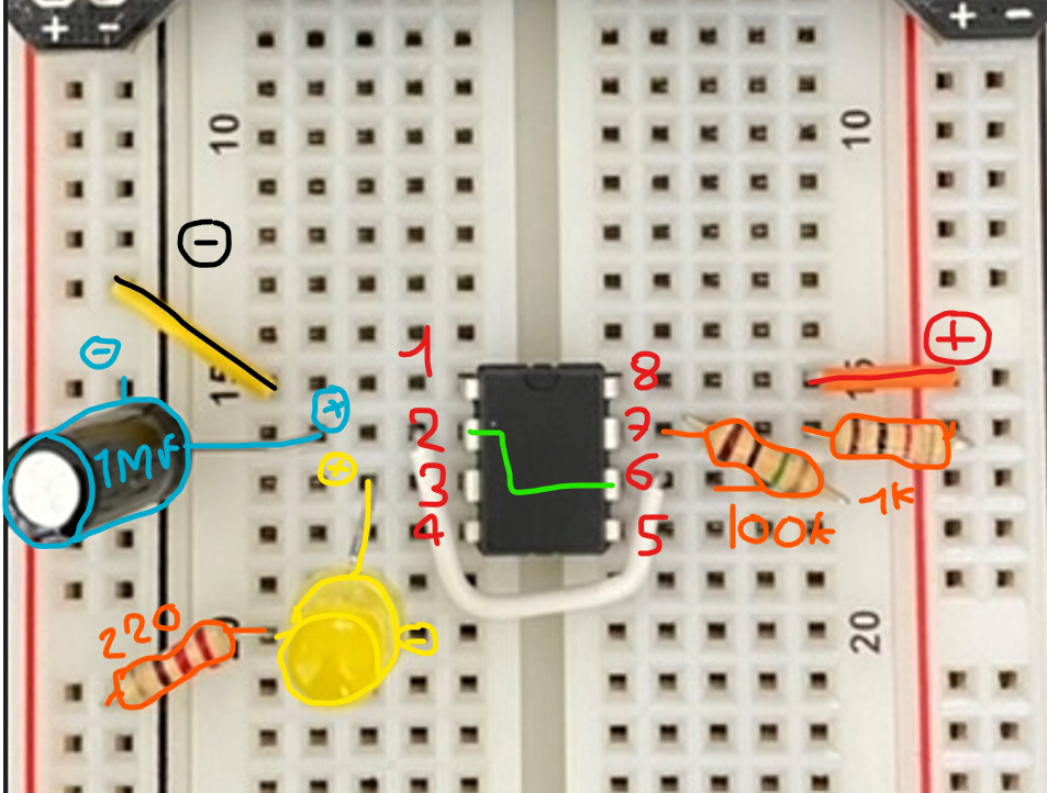 For a better understanding of the schema here is the picture of a simple working 555 timer with an LED output. Here is the list of the components:
