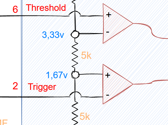 Here is a simplified schema of this circuit and the inside of the 555 timer.