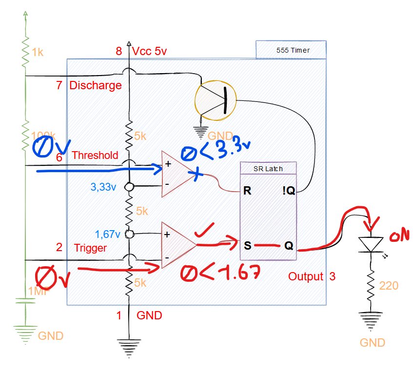 From PIN 2 (red) 0v go to the first comparator and since 0v is below 1,67vm the comparator is going to be turned ON and trigger the SET (S) PIN of the SR Latch. The SET is ON so it will trigger the output to the LED and turn it ON.