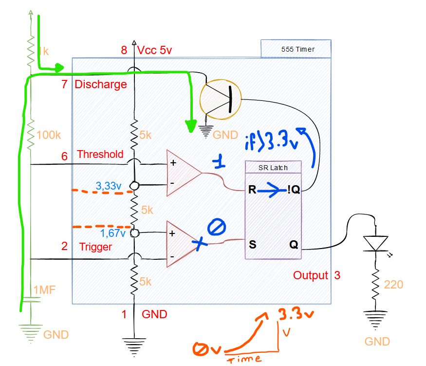 The output (Green) is going to be RESET and the current will flow to the discharger through the 1k resistor. The capacitor will also discharge itself to the discharger. In green, you can see the discharge Path.