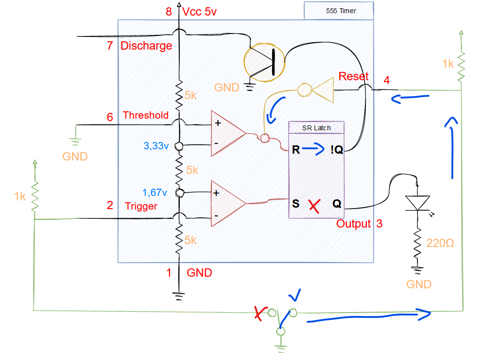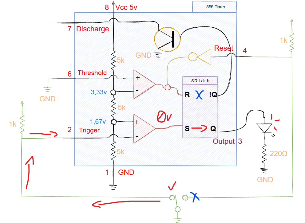 On the other hand, the RESET pin is used when the switch is OFF on it (GND) will trigger the R PIN on SR Latch and the LED will be OFF
